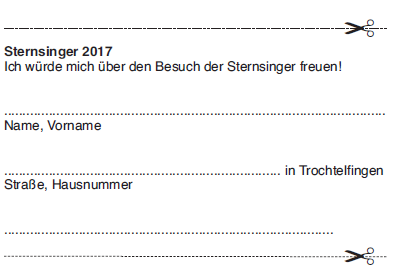 Sternsinger wünschen, auch besuchen, bitten wir Sie den unteren Abschnitt auszufüllen und bis Montag, 2. Januar im katholischen Pfarramt in Trochtelfingen einzuwerfen.